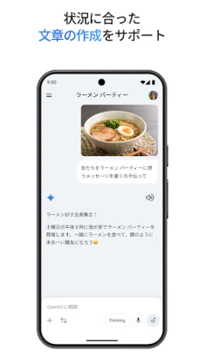 Google の最先端AIアシスタント、Gemini。アイデア出しから文章作成、日々の生産性向上まで、あなたの創造性と効率を強力にサポートします。複雑なタスクもGeminiにお任せください。