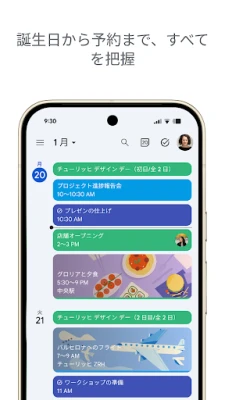 Google カレンダーは、あなたの多忙な日々をスマートに整理し、大切な瞬間を見逃さないためのパーソナルアシスタントです。Gmailに届くフライトやホテル、イベントの予約情報から、あなたのスケジュールへ自動で追加される機能は、もう手動での入力は不要です。Androidスマートフォン、タブレット、Wear OSデバイス、そしてPCと、あなたが今使っているどのデバイスからでも、Google アカウントにログインするだけで、常に最新の予定にアクセスし、作業をシームレスに継続できます。