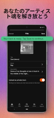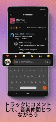 お気に入りのサウンドを見つけたら、自分だけのコレクションに加え、心に残るプレイリストを作成して自由に共有しましょう。SoundCloudは単なるリスニングプラットフォームではなく、情熱を共有する活気あるコミュニティです。お気に入りのアーティストをフォローし、彼らの創造性を直接支持し、世界中のファンと繋がることができます。「いいね!」、リポスト、コメントを通じて、音楽への愛を表現し、魅力的なトラックやプレイリストをソーシャルメディアで共有しましょう。そして、もしあなたがクリエイターなら、SoundCloudへ直接楽曲をアップロードし、何百万ものリスナーに向けてあなたの才能を発信。ファンによるストリームは、インディーズアーティストの活動を直接サポートする力となります。