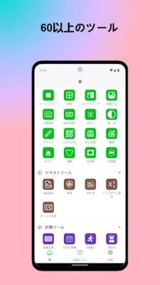 7つのカテゴリーに整理された、60を超える多様なツールを一つにまとめたアプリ。日々の作業から専門的な用途まで、あらゆるニーズに応える機能が満載です。